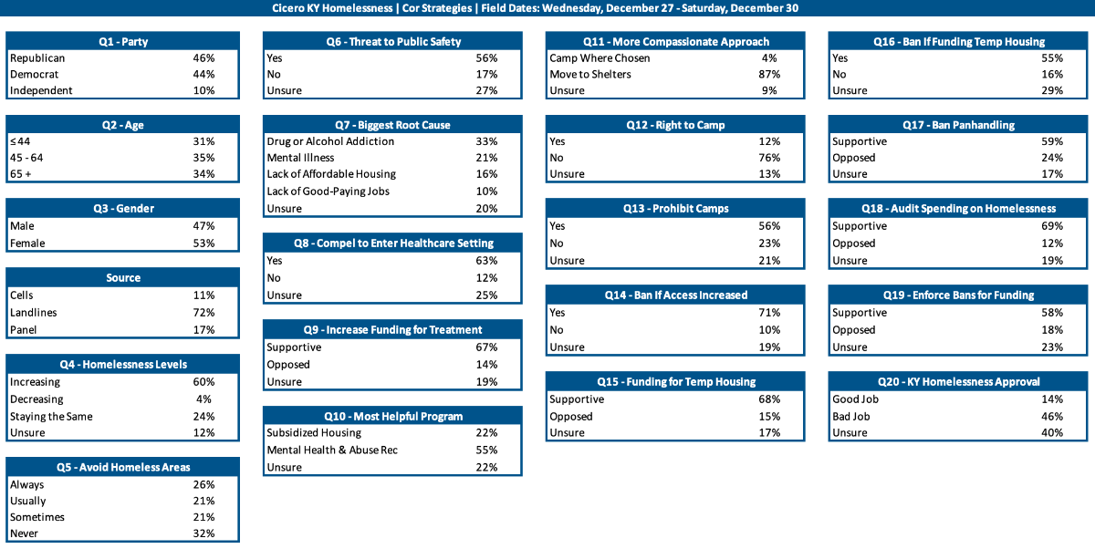 The Cicero Institute partnered with Cor Strategies to conduct an opinion survey about Kentuckians' sentiments about the issue. The survey provided insight into the widespread concerns around public safety and street camping and showed broad support for focusing on solutions that help people escape the cycle of homelessness.