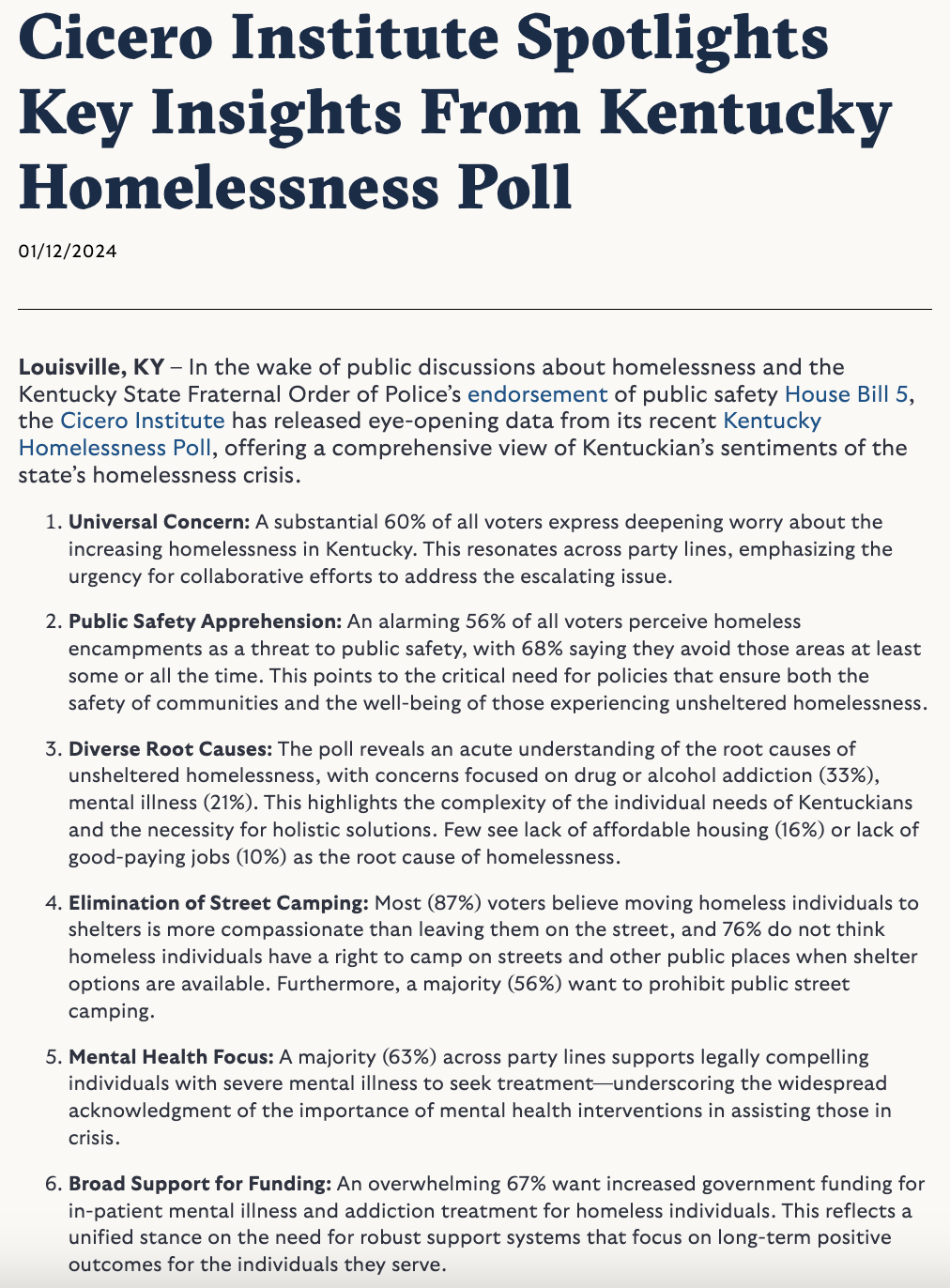 Cicero Institute has seen tremendous success in turning polling data into optimized messaging. As a result, their model homelessness legislation was enacted in multiple states—including Kentucky where the General Assembly overrode the governor's veto since the bill had so much support, Florida, Oklahoma, and Georgia—in just the first few months of 2024 and is making headway in several other states.